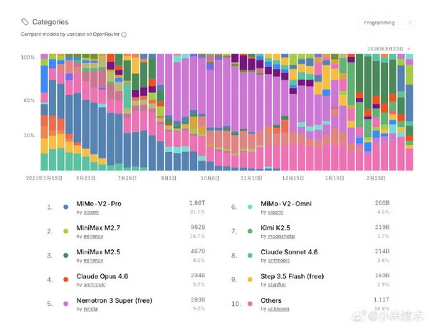 小米MiMo-V2-Pro获OpenRouter周榜第一 市占率超30%