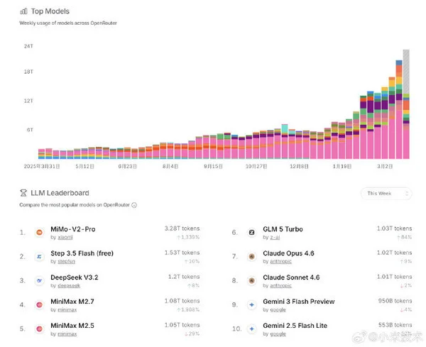 3月27日,小米官方发文称,自研大模型Xiaomi MiMo-V2-Pro在OpenRouter平台最新周榜中位列第一,成为该平台首个周Token消耗量超过3万亿的模型,模型使用市占率超过30%。此前,该模型以匿名形式在OpenRouter上线进行早期测试,周榜数据公布后,小米正式确认其为MiMo-V2-Pro的早期版本。