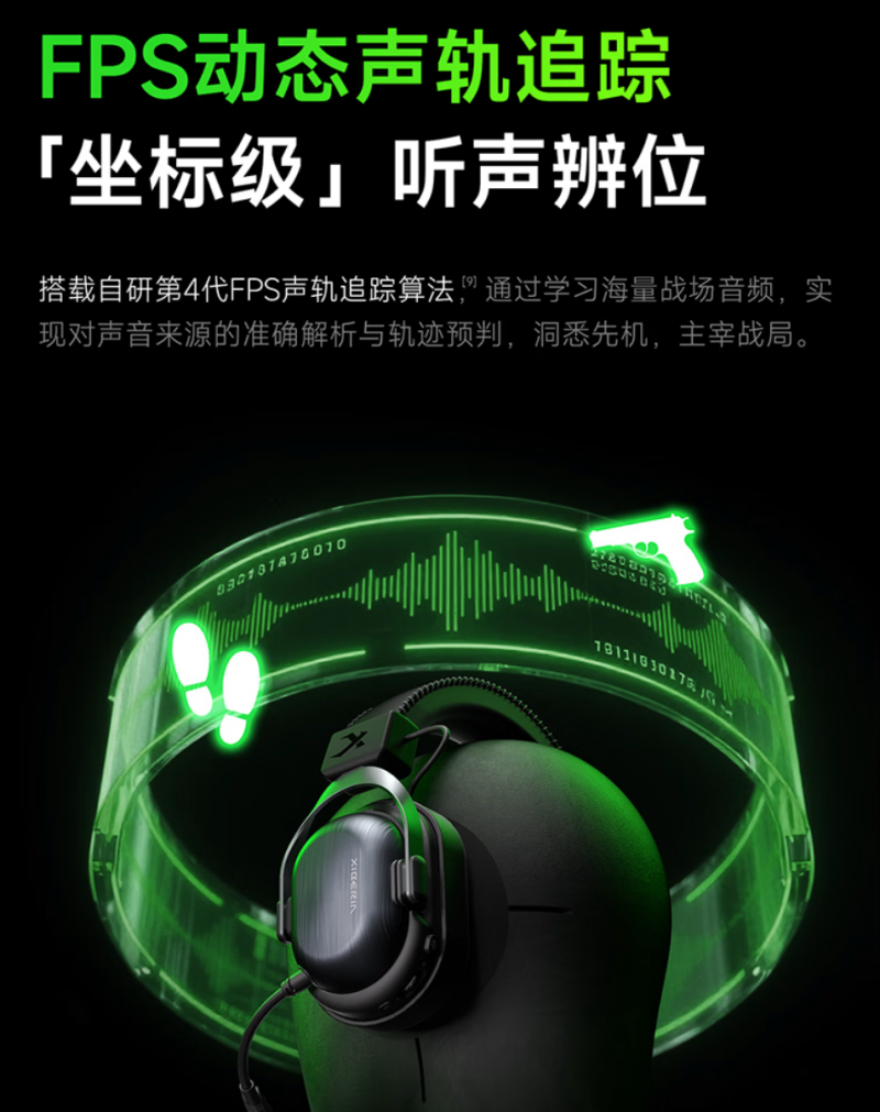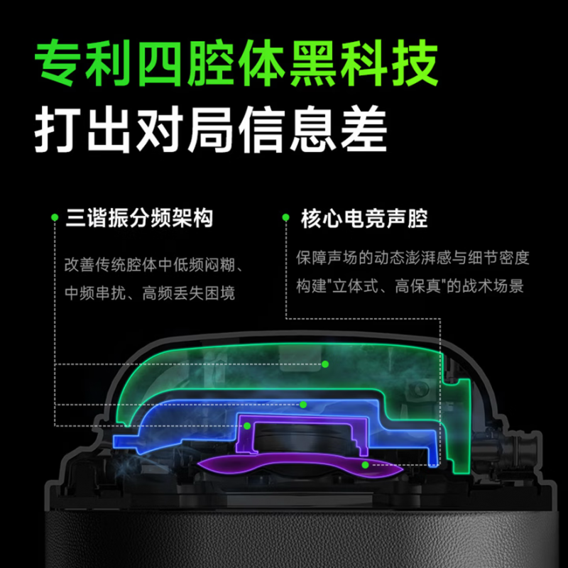 腔体是声音的容器,也是决胜的关键。这款耳机采用专利四腔体分频黑科技,打出对局中的信息差。“1+3从式”四腔体声学架构,将不同频段的声音剥离、强化,彻底解决了传统腔体串扰带来的方向感模糊、远近层次模糊的问题。三谐振分频架构直击传统耳机的低频闷糊、中频串扰、高频丢失三大痛点,让声音不再是一团混沌,而是枪声反馈优化提升32%、低频脚步优化提升53%、声源定位优化提升42%,实现坐标级索敌,隔墙也能精准预判。