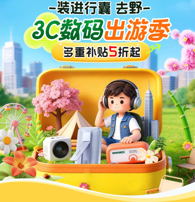春光明媚,草长莺飞,清明小长假正是拥抱自然的好时节。无论是近郊踏青、山野露营,还是跨城旅行,一套趁手的数码装备都能让旅途更轻松、更出片、更安心。目前,京东3C数码出游季已开启,精选户外电源、运动相机、开放式耳机等多款户外休闲装备,并带来以旧换新叠国补5折起、30天意外换新等权益,助大家轻松装进行囊,畅享春日好时光。无论你是打算近郊踏青,还是规划远途旅行,京东3C数码出游季都为你备好了趁手装备。现在打开京东APP,搜索“3C数码出游季”,一键开启你的春日出行新体验。